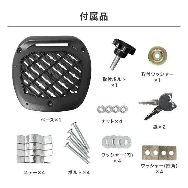 | 商品内容 | 本体 ベース×1 取り付けボルト×1 取り付けワッシャー×1 ナット×4 ステー×4 ボルト×4 ワッシャー(円)×4 ワッシャー(四角)×4 鍵×2 |