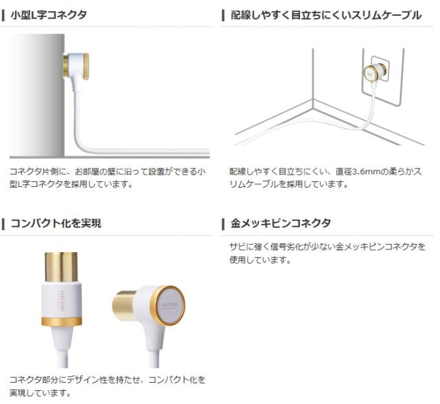 地上波放送、4K8K放送の視聴、録画に最適なTV接続用アンテナケーブルです。 4K8K放送(周波数帯域〜3224MHz)の受信に強い3重シールド構造です。 ノイズを減らし、地上波デジタル放送、BS/CS放送の受信に強いテフロン線材を使用しています。 コネクタ部分にデザイン性を持たせ、コンパクト化を実現しています。 コネクタ片側に、お部屋の壁に沿って設置ができる小型L字コネクタを採用しています。 配線しやすく目立ちにくい、直径3.6mmの柔らかスリムケーブルを採用しています。 サビに強く信号劣化が少ない金メッキピンコネクタを使用しています。 ※本製品は屋内用です。 ※本製品を使用することでBS/CS放送や4K8K放送が視聴できるわけではありません。 ※受信アンテナの位置や環境、接続機器によっては放送を綺麗に受信できない場合があります。