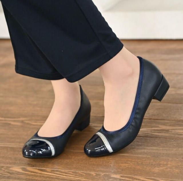 つま先の切り替えしデザインと主張しすぎないラメのラインがワンポイントになる1足です。
