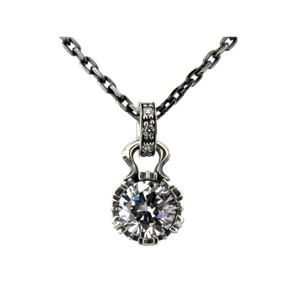 王冠の中にクリアキュービックを抱いた、キュートさと気品を併せ持つペンダント。クラウンの面にはクロス、フラワー、フレアーデリスを巧みに織り込み、ミルと透かしで立体感を演出。随所に散りばめたストーンが繊細にきらめき、鏡面の艶と燻しの陰影がモチーフに奥行きを与えます。小ぶりでも存在感は十分で、Tシャツからドレスまで幅広くマッチ。熟練の彫り込みと精密な石留めはACならではのクオリティです。石はまばゆいクリアとシックなブラックの2バリエーションを用意。色違いのペア使いや重ね付けでのコーディネートもおすすめ。ギフトにも最適な、長く愛せる一本。