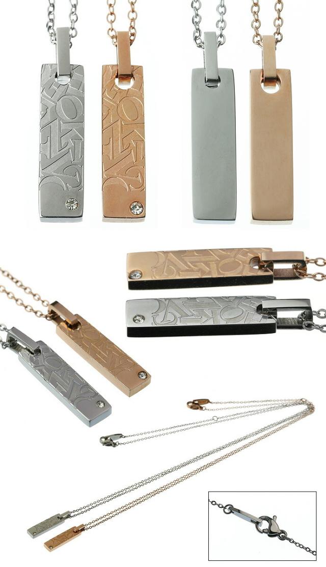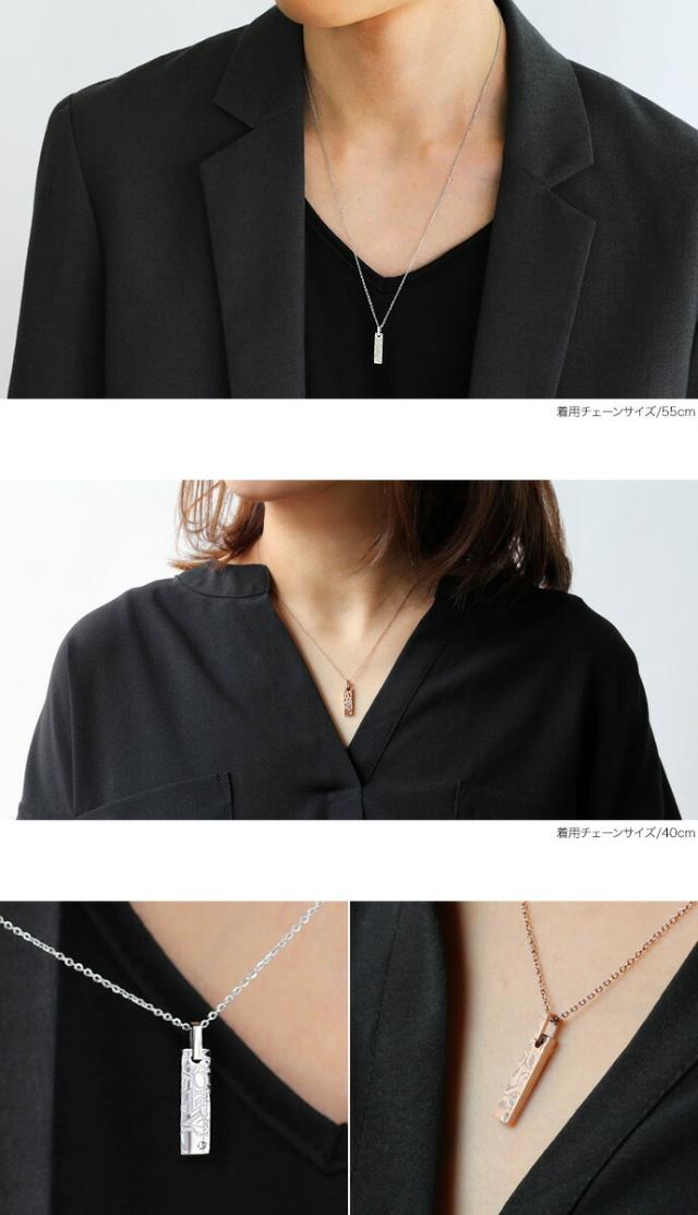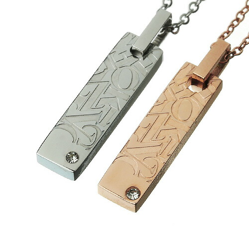 アルファベットがランダムに配置されたデザインがクールなペアペンダントです。スティック型の土台は小振りながら、下部にセットされたジルコニアがアクセントになり首元を印象的に飾ってくれます。メンズはシルバー、レディースはピンクゴールドカラーをご用意。素材には医療器具にも使われているサージカルステンレス316Lを使用。金属アレルギーも出にくく、お手入れも不要なので安心してお使いいただけます。