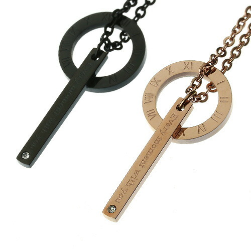 ローマ数字が刻印されたサークルと、ジルコニアが輝くスティックがセットになったペアペンダントです。スティックには「Every moment with you(いつ何時もあなたと共に)」と刻印されており、2人の時を刻む振り子時計のように首元で揺れ動きます。メンズはブラック、レディースはピンクゴールドカラーをご用意。素材には医療器具にも使われているサージカルステンレス316Lを使用、金属アレルギーも出にくく、お手入れも不要なので安心してお使いいただけます。
