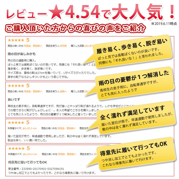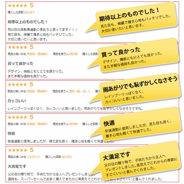 - 雨の日の心強いお供に! 履きやすく、履き心地も良いうえに、性能もしっかりしています。 もう少し丈があると、自分での跳ね上げや、跳ね返りも安心ですが、 性能上、履き心地や脱ぐときに支障がありそうで、ここ...