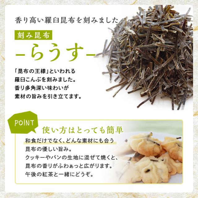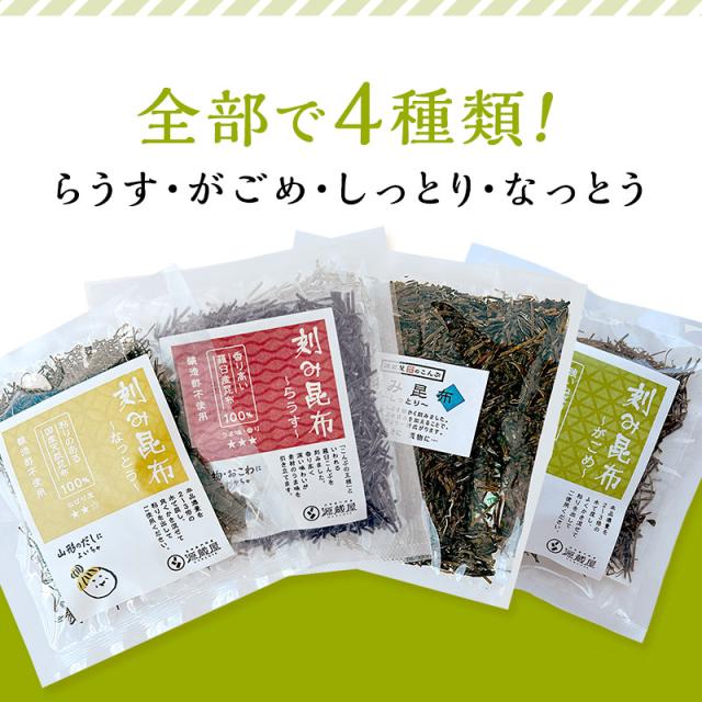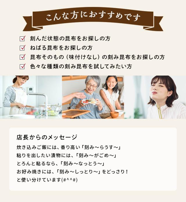 下記の4種類の中からお好きな3袋をお選びいただけます。※刻み昆布〜なっとう〜は、乾燥タイプです。 味付きタイプの「納豆こんぶ」とは別商品となりますのでご注意下さい。■商品名 刻み昆布~らうす~■内容量 45g■原材料 昆布(北海道羅臼産)■賞味期限 出荷時120日以上■商品名 刻み昆布~がごめ~■内容量 30g■原材料 昆布(青森産)■賞味期限 出荷時120日以上■商品名 刻み昆布~しっとり~■内容量 65g■原材料 昆布(北海道産)、醸造酢/酸味料■賞味期限 出荷時100日以上■商品名 刻み昆布〜なっとう〜■内容量 25g■原材料 天然昆布(北海道産)■賞味期限 出荷時120日以上