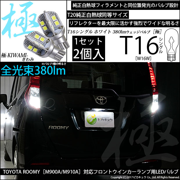 | ピカキュウ,LED専門店,LEDバルブ,国産DC12V車,LED,SMD,T16シングル,W16W,バックランプ,ホワイト,全光束380lm,ハイブリッド車対応,極,KIWAMI,きわみ,TOYOTA,トヨタ,ROOMY,ルーミー,M900A対応,M910A対応 |
