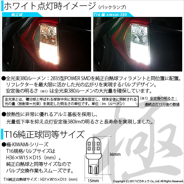 | 2835型POWER SMDを16個マウントしリフレクターを最大限に活かす強烈でワイドな照射光を可能にした「極-KIWAMI-」LEDバルブシリーズが新発売です。 純正白熱球フィラメントと同位置にSMDを配置。理想的な光の広がりを実現しました。LEDバルブ1球で明るさ全光束380ルーメン(lm)のスペックのバックランプ専用T16シングルウェッジ球。 バックランプとして必要十分な光量を確保しています。 | ||||