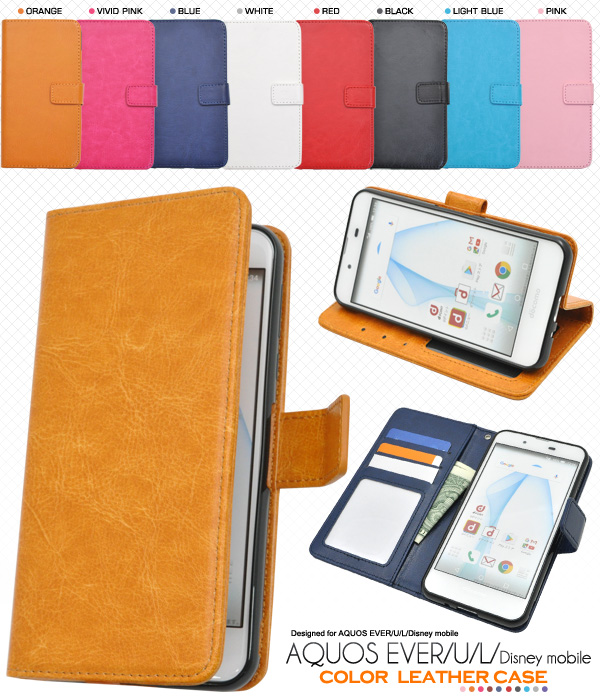 スマホケース 手帳型 カラーレザーケース AQUOS EVER SH-02J AQUOS U SHV37 Disney mobile DM-01J AQUOS SH-M04 AQUOS L UQ mobile 横開き 合皮 無地 シンプル 黒 赤 青 橙 白 水色 ピンク スマホカバー 保護ケース 人気