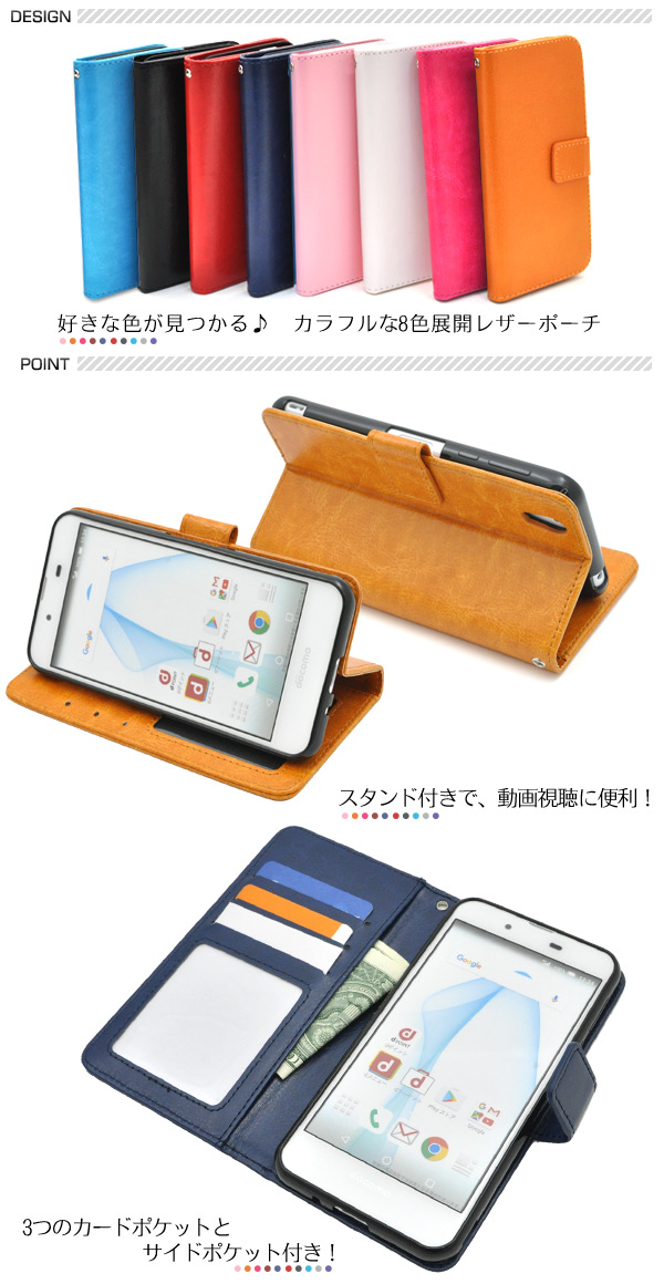 | カラフルな8色展開のAQUOS用カラーレザースタンドケースポーチ。衝撃やキズなどからAQUOSを守ります。 また、内部はソフトケースなので着脱が簡単です。背面を折り返すとスタンドとして使用できるので、動画視聴に便利です。落下防止に最適なストラップとストラップホール付きです。 横開きタイプなので、手帳のように使うことができます。また、内側に3つのカードポケットとサイドポケットが付いています。 ※AQUOSは付属しません。 ※ライセンス商品ではありません ※カードは付属しません。 | ||||||||||