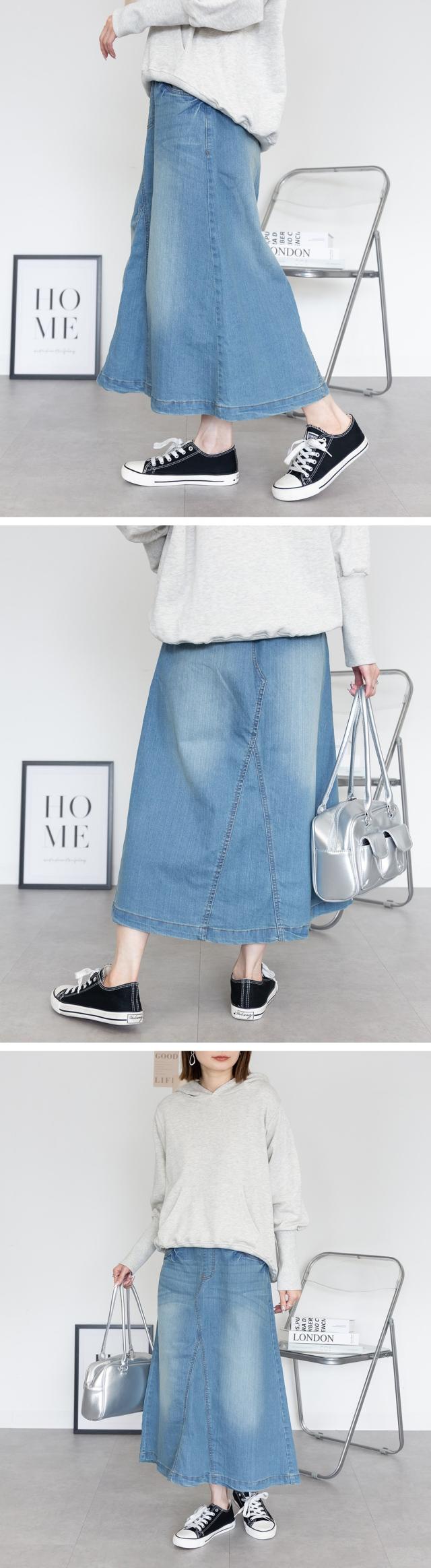 どんなコーデにもすんなり取り入れられるオールシーズン大活躍の定番デニムスカートが入荷しました!!ロング丈で使いやすい♪女性らしさを引き立てるロング丈のデニムスカートです☆ストレッチ素材に、ウエストはリブゴム+調節紐入りで安心感ある履き心地に大満足♪ヴィンテージ風加工デザインでこなれ感もたっぷり☆バックのポケットにもデザイン性を取り入れて、ベーシックな中にもオシャレ感をしっかりアピール出来ちゃいます!!選べる3色展開。