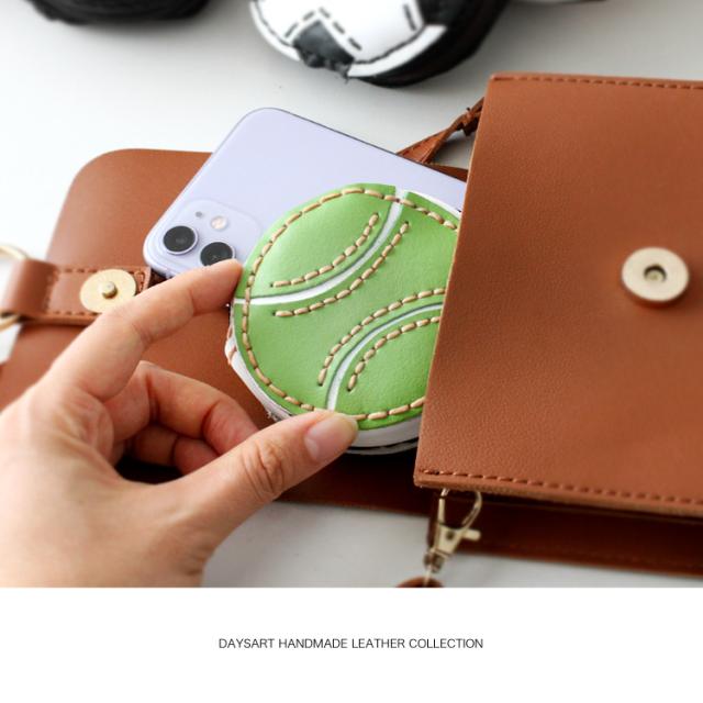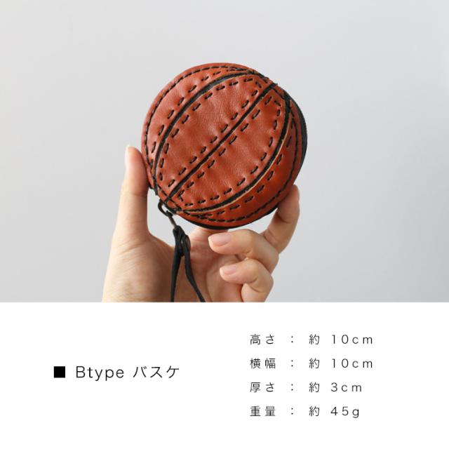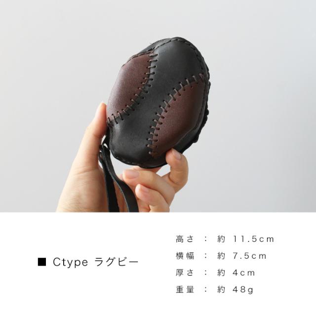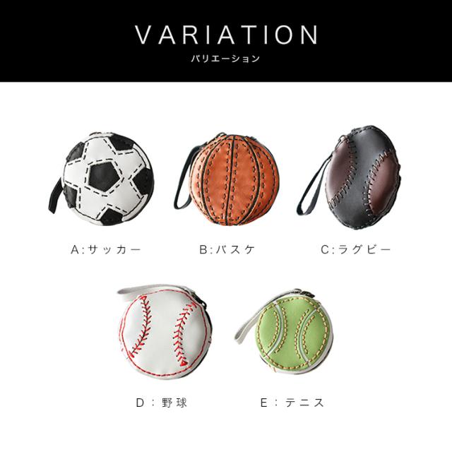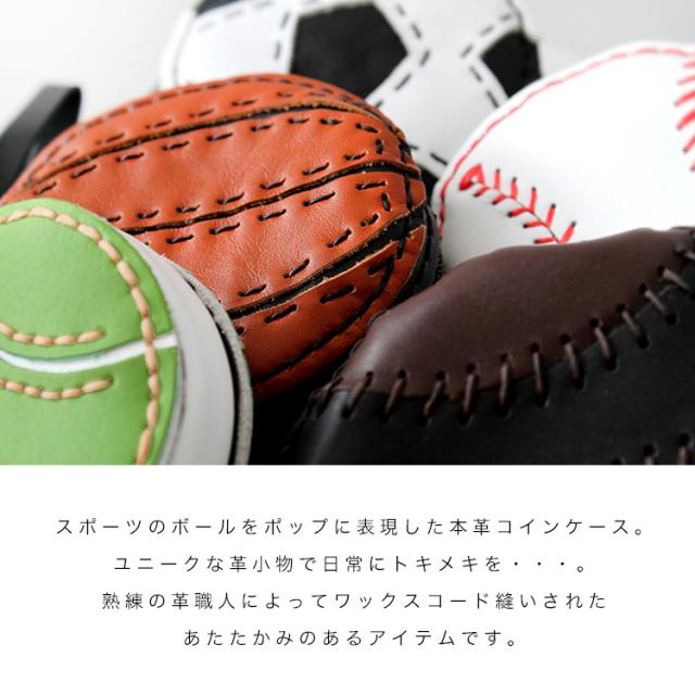 本牛革を使用したファスナー式ののコインケースです。野球、バスケットボール、ラグビーと3つの種目のボールをデザインしたユニークな形になっています。ワックスコード縫い合わされており、ハンドメイド感溢れる仕上がりです。ストラップ付きで開閉と持ち運びに便利です。