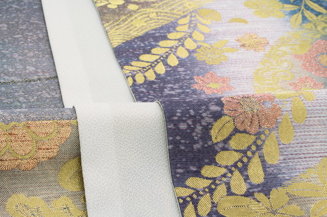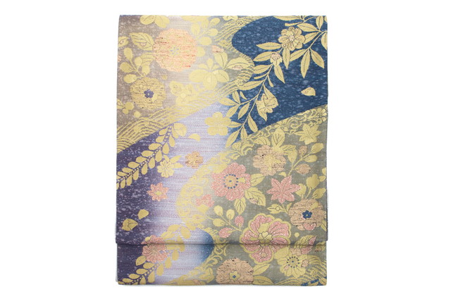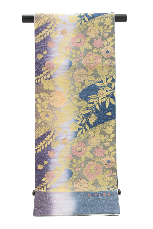 【未仕立て】袋帯 振袖用 紺色 ネイビー 青紫色 金色 グラデーション 花唐草 桜 流水 京都西陣織 2409 酒井守 六通柄 成人式 フォーマル 日本製 送料無料