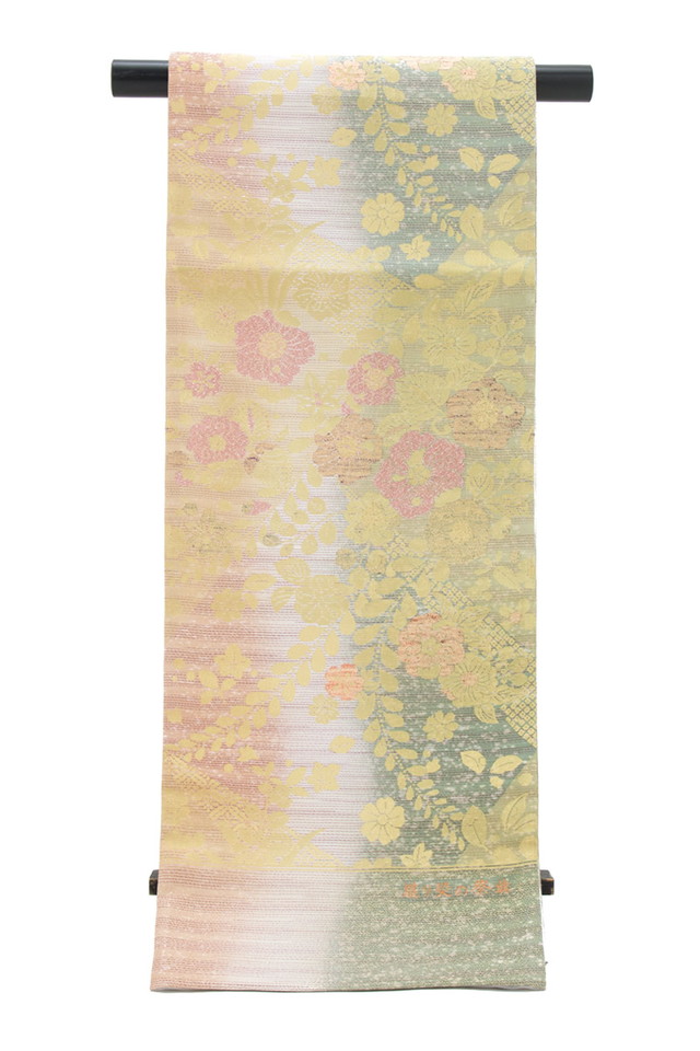 【未仕立て】袋帯 振袖用 金色 ゴールド 緑青色 グラデーション 花唐草 牡丹 菊 雲 京都西陣織 2409 酒井守 六通柄 成人式 フォーマル 日本製 送料無料