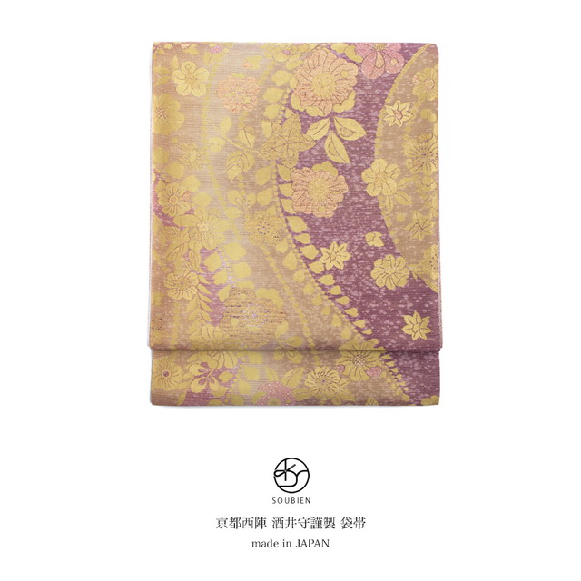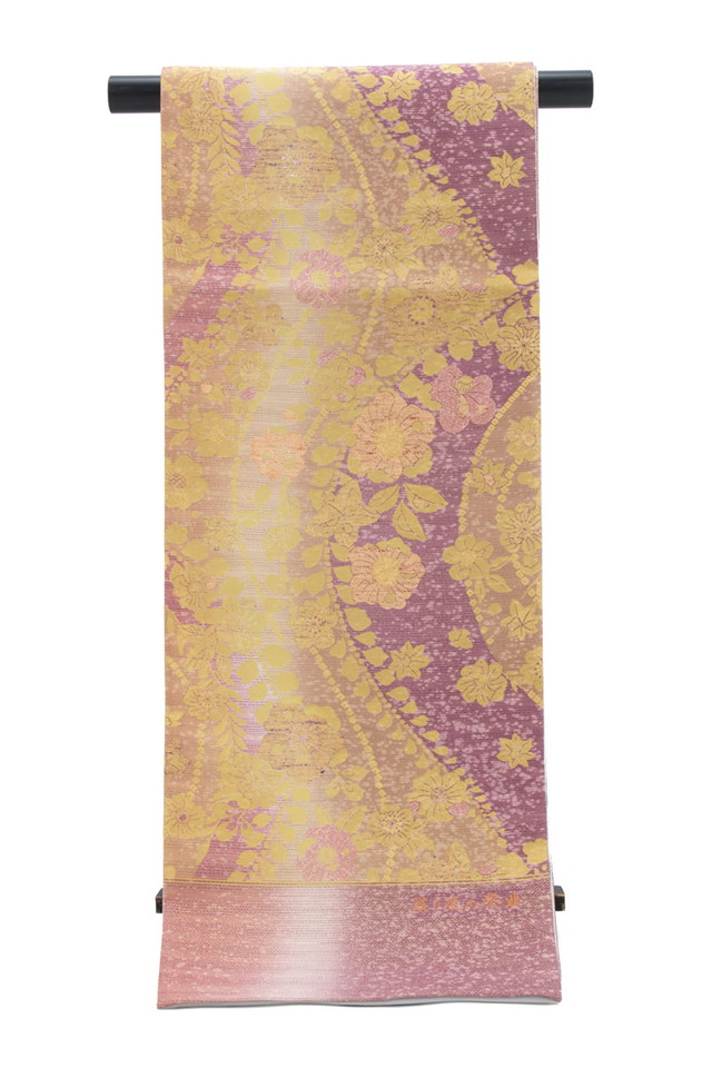 【未仕立て】袋帯 振袖用 赤紫色 パープル 金色 ゴールド グラデーション 花唐草 牡丹 菊 京都西陣織 2409 酒井守 六通柄 成人式 フォーマル 日本製 送料無料