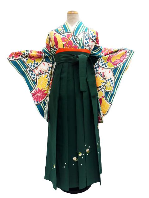 | 商品説明 | 対応身長 155cm-165cm 身丈 165cm 裄68cm 袖丈76cm ヒップ110cmまで 緑地に松と桜と菊柄の二尺袖と、緑地に桜の刺繍の袴のセットです。 セット内容 着物・袴・袴下帯・重ね衿・長襦袢(半衿付き) 足袋・衿芯・腰ひも3本・伊達〆2本・前板 草履・バッグ 着用に必要な物は全て揃った安心のフルセットを専用バッグに入れてお届けします。 補正に必要なタオルのみご用意ください。帯や帯揚・帯〆は、おまかせとなります。 |