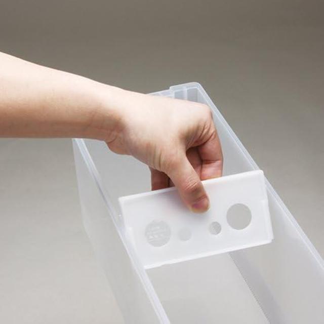 ケースの内部にギザギザの筋が付いていて、3mm間隔で仕切り板を移動できます。収納物に合ったところにぴったり仕切りを立てることができます。収納スペースが余っても転倒防止用の仕切り板が付いているので倒れません。
