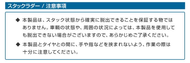 | 注意事項 | ・商品は、スタック状態から確実に脱出できる物ではありません。車輌の状態や、周囲の状況によっては、本製品を使用しても、脱出できない場合があります。