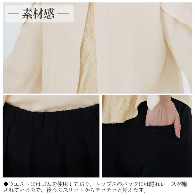 ウエストにはゴムを使用しており、トップスのバックには隠れレースが施されており、袖は長めのチューリップスリーブで歩くたびにゆらゆらたなびくのでオシャレに見えます。