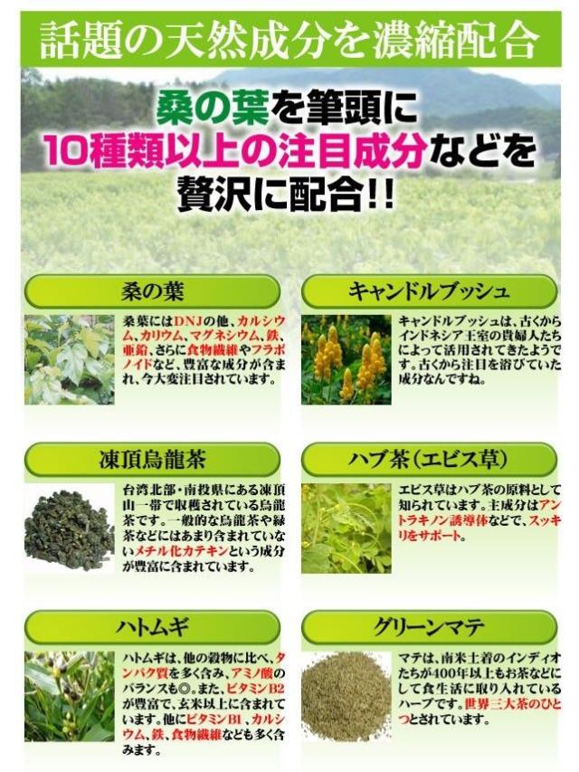 | 原材料名 | 桑の葉、キャンドルブッシュ、エビス草、ハトムギ、凍頂烏龍茶粉、杜仲茶、ドクダミ、国産生姜、黒豆 プーアル茶、トウキシ、グリーンマテ、ローズヒップ、ごぼう |