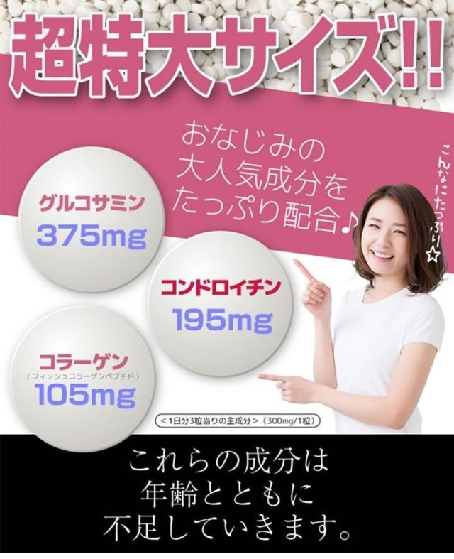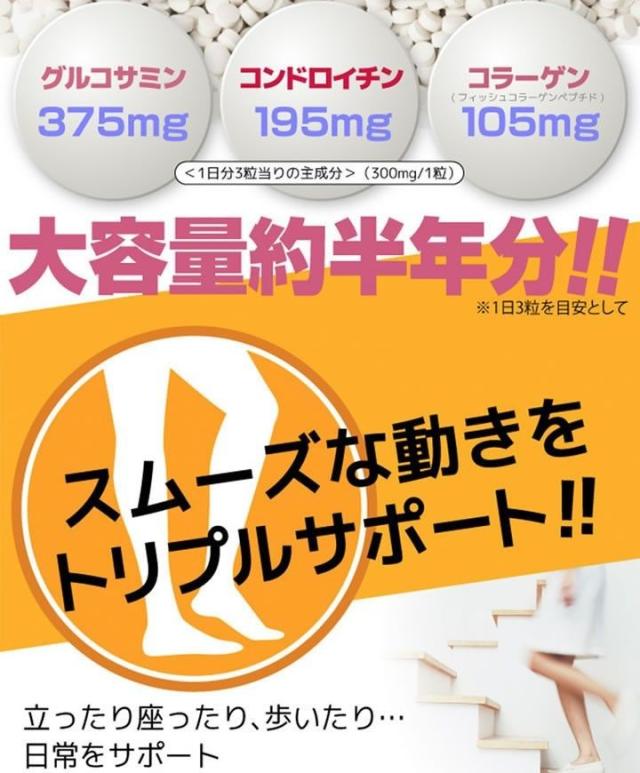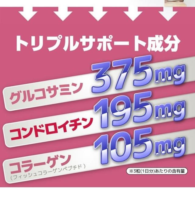 グルコサミン375mg、コンドロイチン195mg、コラーゲン(フィッシュコラーゲン)105mg<1日分3粒当たり>