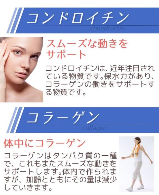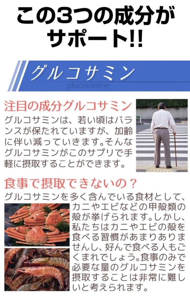 | 原材料名 | グルコサミン塩酸塩(エビ・カニ由来)、鮫のヒレ軟骨抽出物(コンドロイチン含有)、フィッシュコラーゲンペプチド デキストリン、ショウガ末、セルロース、ショ糖脂肪酸エステル、微粒二酸化ケイ素、ビタミンC <主成分1日分3粒当り>(300mg/1粒) ●グルコサミン375mg ●コンドロイチン195mg ●フィッシュコラーゲンペプチド105mg |