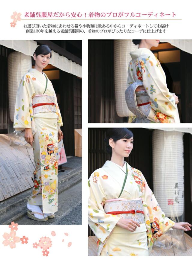 | ※モデル着用の袋帯・帯締め・帯揚げ・草履バッグ・小物類の色、デザインはイメージです。 数ある中から呉服のプロがコーディネートしてお届け致します。 | |||