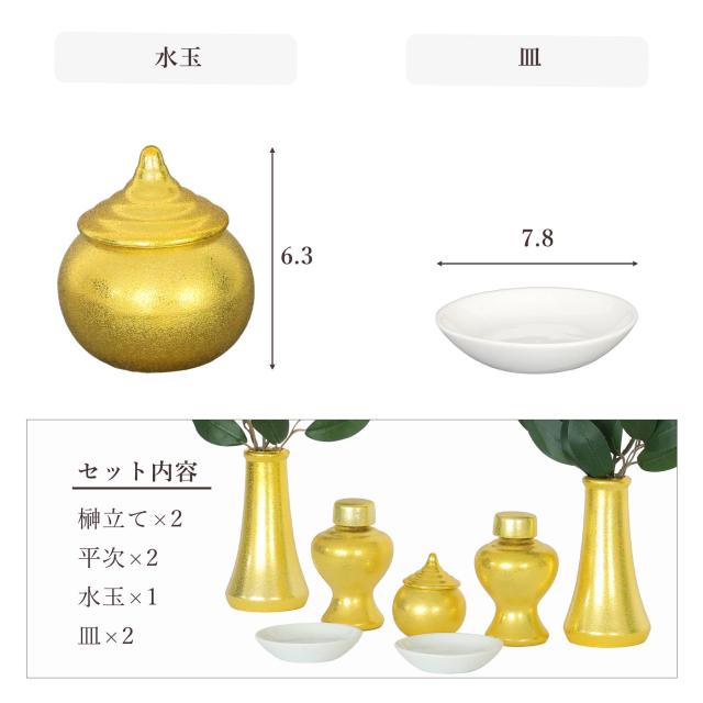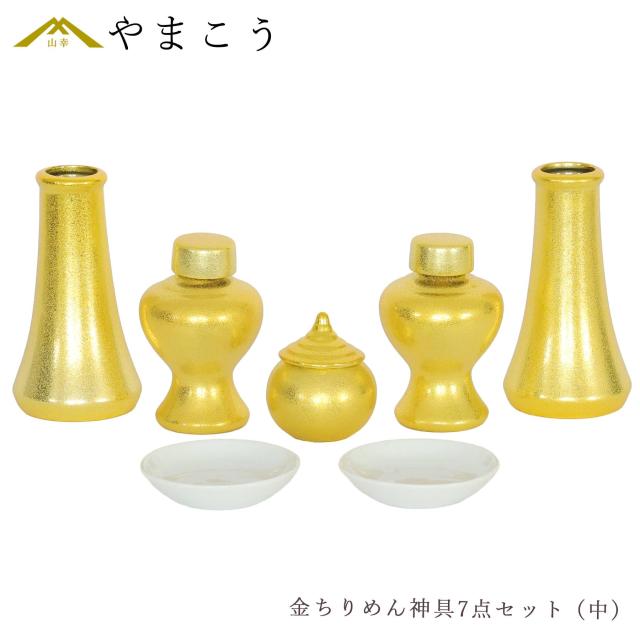 神具セット 黄金神具 金ちりめん 7点 セット 中 榊立て 瓶子 水玉 皿 土器 小〜中型の神棚に モダン お供え お祀り
