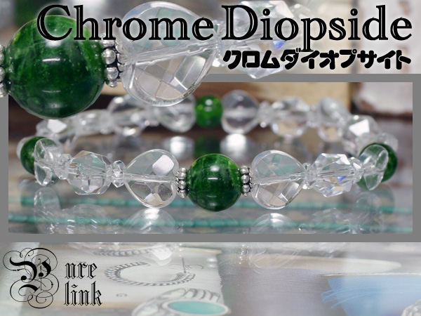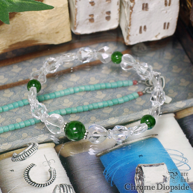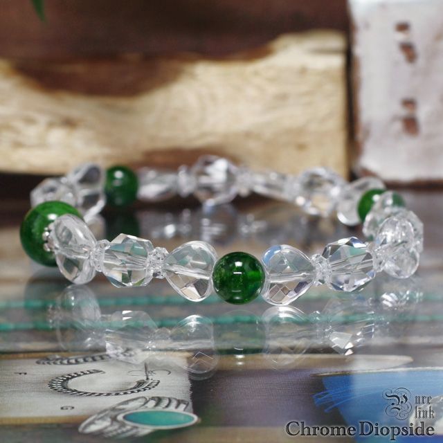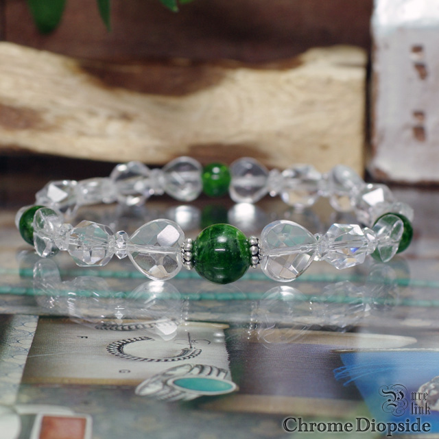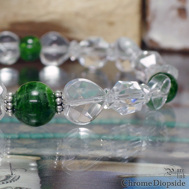癒しの緑石AA+『クロムダイオプサイト』と輝く水晶ハンドメイドブレスレット ハート【ぴゅありんく】