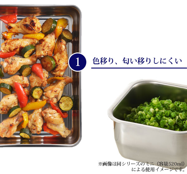 においがつきにくく清潔に使える!高品質な18-8ステンレスを使用しており、傷や汚れが付きにくいので、清潔に使っていただけます。プラスチック容器だと食品の匂いが残ってしまうような、らっきょなどの漬物やキムチ、ネギなどの薬味、カレーなどもステンレス容器なら安心して入れていただけます。また、餃子のたね作りや、ハンバーグ作りなどの下ごしらえにも使っていただきやすいです。酸の食品にも強いので、マリネを作る際にもお使いください。