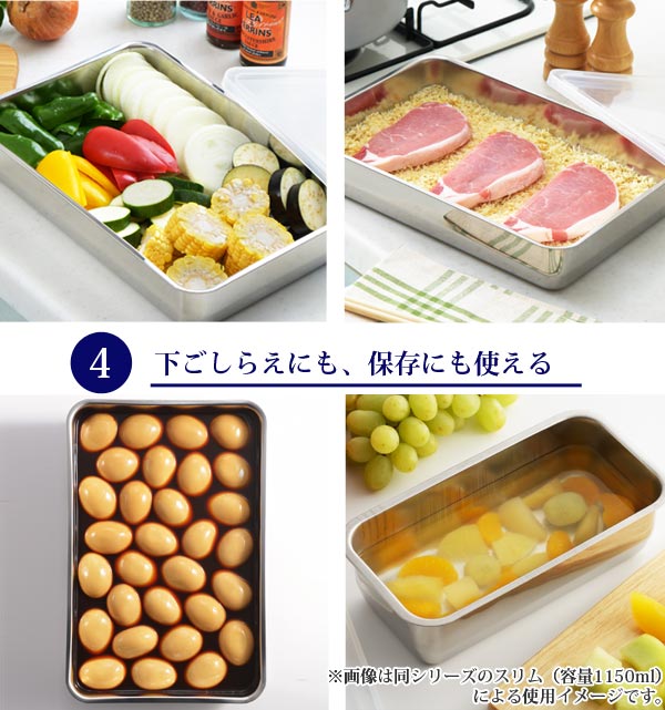 バットのように使って下ごしらえ〜保存まで下ごしらえがきちんとできてこそ、手際よく、美味しい料理がつくれるもの。この保存容器に切った食材を入れておいたり、粗熱をとったり、パン粉をつけるのに使ったりと、バットのように下ごしらえに使っていただけます。また、下ごしらえの際に、どうしても台所が手狭に感じられるものですが、容器が角型ですので縦横を交互にして積み上げることができ、省スペースで調理が行えます。さらに、魚のマリネやお肉の下味をつける際、水ようかんやゼリーなどを固める際にも、そのままフタをして冷蔵庫に入れて保存できます。