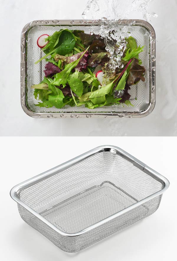 ●足付きで水切れがよく、丈夫なステンレス製の角型ザルです。