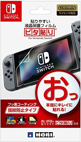 コメント:カンタン、確実、キレイに貼れるのが「ピタ貼り」です! ◇「Nintendo Switch」専用の液晶保護フィルム(防指紋タイプ)です。 ◇弊社特許技術「ピタ貼り」による、位置合わせ・貼り付けが失敗しにくい構造が特徴です。 ◇光沢性防指紋コートを施しており、指紋がつきにくくなっております。 ◇クリーニングクロス、気泡追い出し用のヘラを付属。 ◇任天堂製品との適合性・素材の安全性が確認された、正式ライセンス商品です。