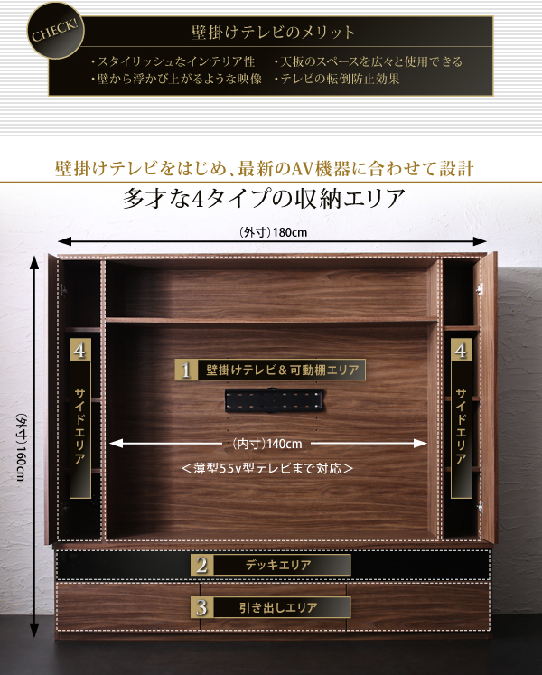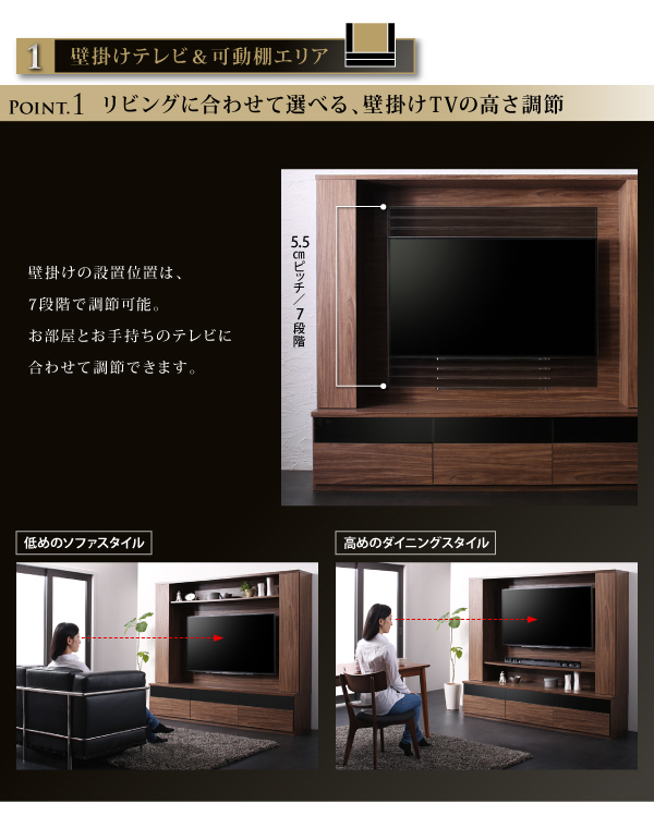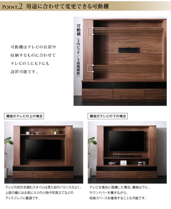 壁掛け機能付きでテレビ位置をお好みの位置に設置できます。 高級感のあるウォールナット仕上げ。
