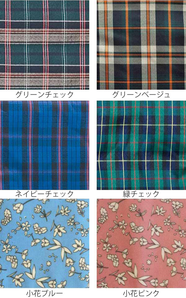 | 種類 | グリーンチェック、グリーンベージュ、ネイビーチェック、緑チェック、小花ブルー、小花ピンク、Yブラウン、ローズ、イエローブルー、チェックオレンジ |