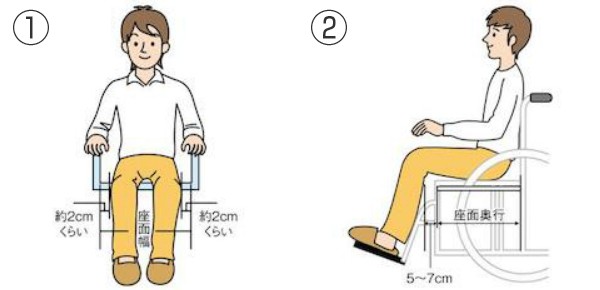 | (1)座面幅 おしりの横で手のひらが入る約2cmくらいのゆとりがあるのが理想です。 | (2)座面奥行(シートの奥行) おしりの後ろから膝の裏までの長さを参考にして、その長さより約5〜7cm短いくらいが理想的です。 |