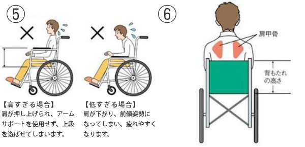 | (5)アームサポートの高さ 座る面から90°に曲げた肘の高さを目安に2〜3cmの高めが理想的です。上がりすぎず下がりすぎない高さを選びましょう。※クッション等を敷く時はその厚みを考慮してください。 | (6)背もたれ 自走できる方は肩甲骨の下端部に触れるくらいの高さが理想的です。※本ページは介助式の車椅子です。 |