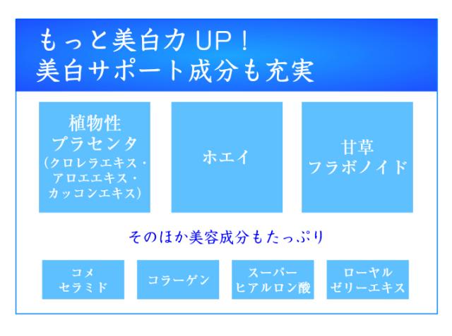 有効成分 アルブチン その他の成分 濃グリセリン、DPG、ソルビトール液、POEメチルグルコシド、アセチルシステイン、ローヤルゼリーエキス、水溶性コラーゲン液、アセチル化ヒアルロン酸ナトリウム、リン酸アスコルビルMg、米ヌカスフィンゴ糖脂質、クロレラエキス、アロエエキス-2、カッコンエキス、ホエイ-2、BG、水添卵黄レシチン、卵黄リゾホスファチジルコリン、甘草フラボノイド、DL-PCA・Na液、PCA、スクワラン、ホホバ油、トリ(カプリル・カプリン酸)グリセリン、天然ビタミンE、ジメチコン、セテアリルグルコシド・セテアリルアルコール、ステアリン酸ソルビタン、POEステアリルエーテル、キサンタンガム、粘度調整剤、無水亜硫酸Na、pH調整剤、フェノキシエタノール、メチルパラペン、プロピルパラペン、カラメル