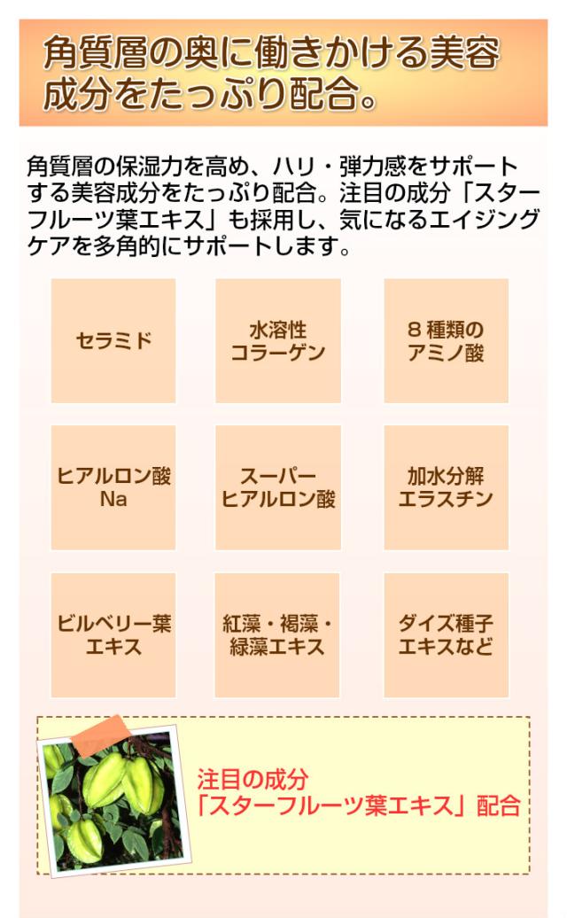 水、DPG、グリセリン、ヒアルロン酸Na、加水分解ヒアルロン酸、アセチルヒアルロン酸Na、加水分解コラーゲン、水溶性コラーゲン、アセチルヒドロキシプロリン、セラミドEOP、セラミドNP、セラミドAP、カンゾウ葉エキス、オウゴンエキス、ゼニアオイエキス、メマツヨイグサ種子エキス、ローヤルゼリーエキス、ダイズ種子エキス、ゲットウ葉エキス、紅藻エキス、褐藻エキス、緑藻エキス、ビルベリー葉エキス、ゴレンシ葉エキス、ベタイン、加水分解エラスチン、PCA−Na、ソルビトール、セリン、グリシン、 グルタミン酸、アラニン、アルギニン、リシン、トレオニン、プロリン、コレステロール、フィトスフィンゴシン、リン酸アスコルビルMg、パルミトイルペンタペプチド−4、PEG−30水添ヒマシ油、PEG−60水添ヒマシ油、ラウロイルラクチレートNa、ポリソルベート20、カルボマー、キサンタンガム、クエン酸、クエン酸Na、フェノキシエタノール、メチルパラベン、BG