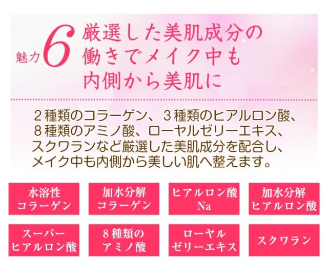 酸化チタン、酸化亜鉛、シリカ、タウリン、リシンHCl、グルタミン酸、グリシン、ロイシン、ヒスチジンHCl、セリン、バリン、アスパラギン酸Na、トレオニン、アラニン、イソロイシン、アラントイン、フェニルアラニン、アルギニン、プロリン、チロシン、イノシン酸2Na、グアニル酸2Na、アセチルヒアルロン酸Na、スクワラン、ヒアルロン酸Na、加水分解ヒアルロン酸、 加水分解コラーゲン、水溶性コラーゲン、ローヤルゼリーエキス、ジメチコン、アルミナ、ポリメチルシルセスキオキサン、ヒドロキシアパタイト、水、BG、マイカ、酸化鉄