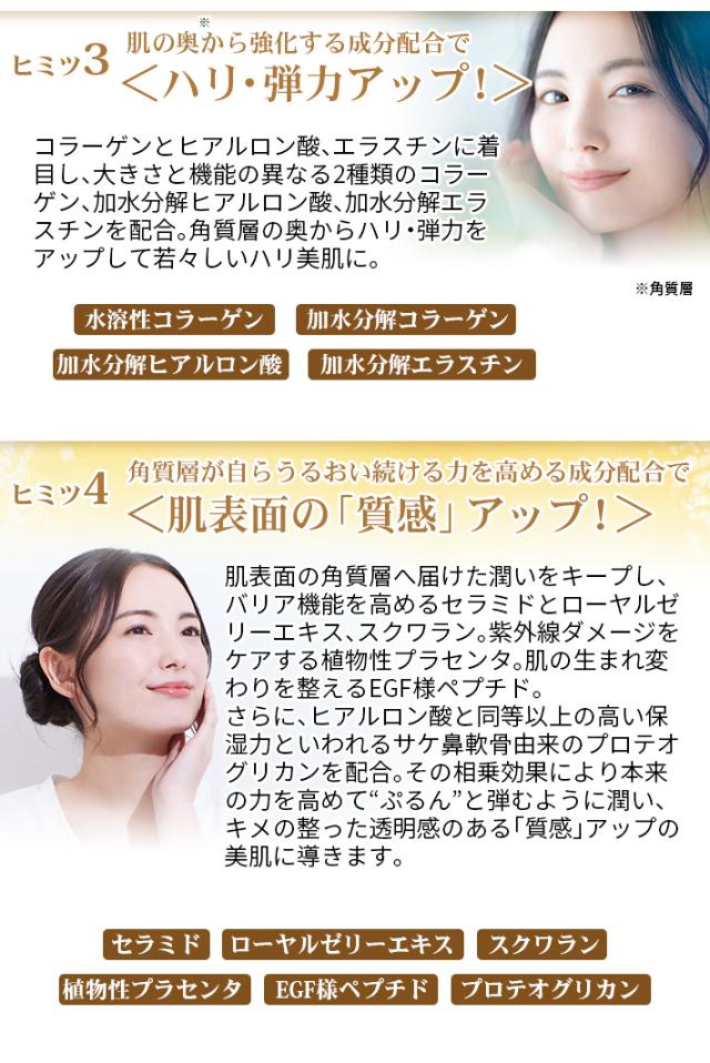水、グリセリン、BG、(PEG-240/デシルテトラデセス-20/HDI)コポリマー、ジグリセリン、加水分解ヒアルロン酸、水溶性コラーゲン、加水分解コラーゲン、加水分解エラスチン、アスタキサンチン、ユビキノン、ヒスチジンジチオオクタナミド(Na/亜鉛)、セラミド2、セラミド3、セラミド6II、ローヤルゼリーエキス、水溶性プロテオグリカン、スクワラン、オリゴペプチド−24、ユキノシタエキス、オウゴンエキス、ブドウつるエキス、カッコンエキス、アロエベラエキス−1、クロレラエキス、イソステアリン酸フィトステリル、ペンチレングリコール、PEG−30水添ヒマシ油、PEG−60水添ヒマシ油、ペンタステアリン酸ポリグリセリル−10、ステアロイル乳酸Na、ベヘニルアルコール、オレイン酸ポリグリセリル−10、ステアリン酸ポリグリセリル−10、トリ(カプリル/カプリン酸)グリセリル、リゾレシチン、フェノキシエタノール、ノバラ油