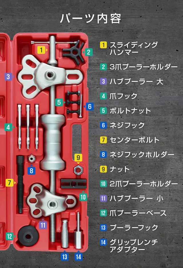 | 商品内容 | スライディングハンマー 3爪プーラーホルダー ハブプーラー大・小 爪フック ボルトナット ネジフック センターボルト ネジフックホルダー ナット 2爪プーラーホルダー 爪プーラーベース プーラーフック グリップレンチアダプター |