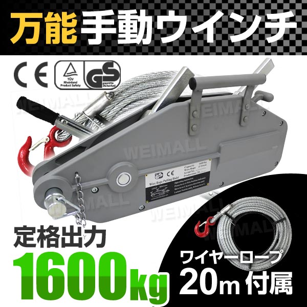 | 商品仕様 | 本体重量(約):11.55kg 本体サイズ(約):550×270×60mm ハンドルサイズ(約):800〜1210×30mm ワイヤーロープ長さ(約):20m(φ11mm) 吊り上げ能力:1600kg 横引き能力:2400kg GS規格(ドイツの工業製品品質保証規格) CEマーク(欧州安全規制適合品) |