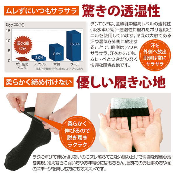 1足で重ね履きのあたたかさ“抜群の保温力”保温性・機能性に優れた「ひだまりダブルソックス」 重ね履きのあたたかさを実現しました。ダブルソックスは、優れた保温性を実現するポリ塩化ビニルを含む「ダンロン(R)」を使用しています。ダンロン(R)は熱伝導率が低いため、 外気温の低下による寒さの影響を受けにくく、体温で温められた空気を外に逃がしません。あたたかい体温はダンロン(R)で肌側にキープし、冷えの大敵である汗や湿気は毛細管現象で外側へ放出します。1足のソックスで重ね履きのあたたかさが期待できます。【対応サイズ】24〜26cm【カラー】黒、グレー、紺 の同サイズ3色組【素材】アクリル、ポリ塩化ビニル、ポリエステル、ナイロン、毛、ポリウレタン【生産国】日本【使用上の注意】乾燥機の使用は避けてください。また熱風などでの乾燥も商品の風合いを損ねる場合がありますので、ご使用は避けてください。【個装形態】各色毎に化粧箱入り(3色・3箱をPP袋入り)