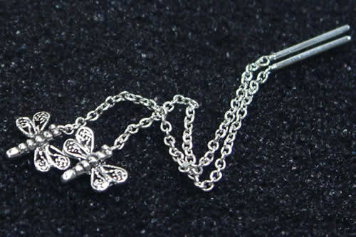 チェーンピアスの先端に蜻蛉をデザインした昆虫ピアス。細部にいたるまで細やかに作られたリアルな昆虫ピアスです。まるで今にも飛び立ちそうなトンボをモチーフにしたシルバージュエリー。装着したときに耳でユラユラ揺れるトンボがリアル。片耳に2つチェーンの長さを変えて着けてもクールに決まるアメリカンピアスです。ボディピアスやエスニックなリングピアスとあわせてコーディネイトしても綺麗です。蝶々のピアスやトンボのピアスと合わせてもグッド!!