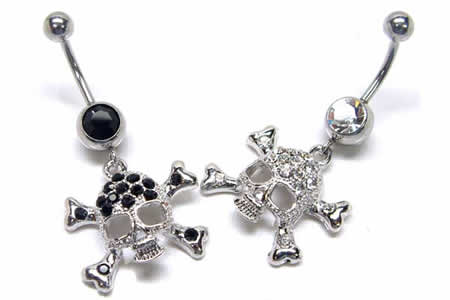 海賊をイメージさせるスカル(髑髏)に眩しいほどの輝きを放つキュービックジルコニアを散りばめたへそピアスです。まるで財宝のようなスカルのヘソピアスは高級感のあるスカルジュエリー。大きく開いたドクロの眼の部分から肌が透けて見えるのがとても綺麗なドクロのへそピアスです。