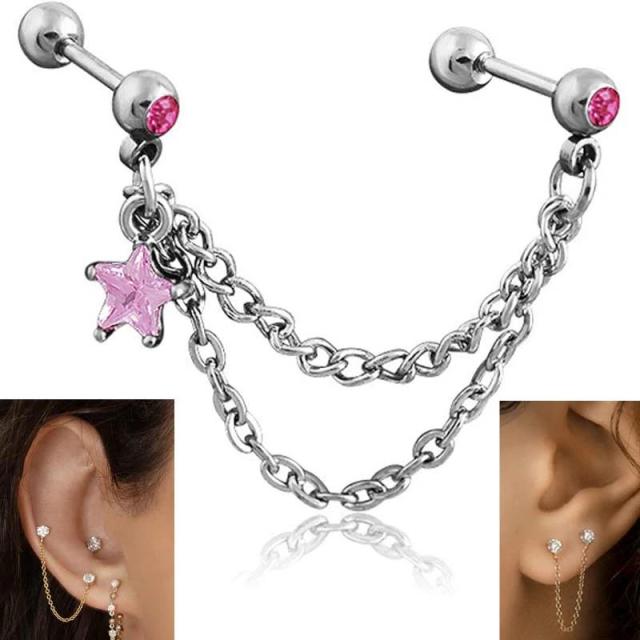 ピンク色のキュービックジルコニアのジュエル付きのストレートバーベルを2本のチェーンでつなげ、星のジュエルスターチャームをセットしたキラキラのチェーンボディピアス。ピアスホールを繋げるチェーンピアスは、存在感もありあり男性彼も女性からも人気。キラキラの星のチャームが揺れるおしゃれなボディピアス。耳たぶ同士をつなげたり、ヘリックスとトラガスをつなげたり軟骨同士をつなげてインダストリアルにしてもお洒落なボディーピアスです。彼氏彼女でペアルックで着けても綺麗に決まるボディーピアス。メンズでもレディースでも使えるのでプレゼントや誕生日ギフトにも!