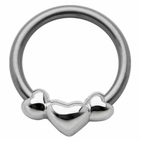 ハートを3つ並べたキュートなハートのキャプティブビーズリング。ハートのモチーフは幾つになっても女の子の憧れ。デザインが正面に向くタイプのビーズリングなので、耳はもちろんニップルやアイブローなどなど色々な部位へのピアッシングが可能です。通常のキャプティブビーズリングより装着しやすいのがうれしい。もちろんシャフトだけでなくデザイン部分も安心の医療用サージカルステンレスです。
