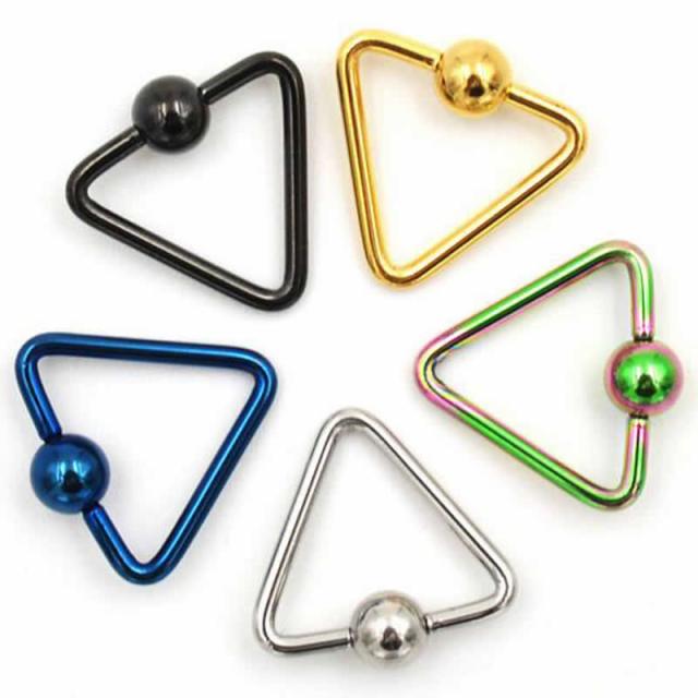 個性的なフォルムの三角形のキャプティブビーズリング。ユニークな形で存在感を発揮してくれるさん三角のビーズリングは、ヘリックスやアイブローなどにもおすすめ。カラーバリエーションも豊富なのでメンズでもレディースでも使えるボディピアスです。プレゼントにもおすすめ。