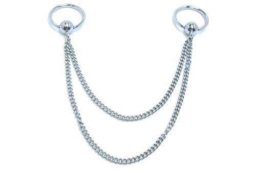 キャプティブビーズリングとキャプティブビーズリングを2つのサージカルチェーンで繋げたチェーンボディピアス。ボディーピアスとチェーンをつなげたハードテイスト満点のボディジュエリー。耳たぶとヘリックス部分をつなげたり、口ピアス(クチピアス)と鼻ピアス(ハナピアス)をつなげたり、アイブロー(眉ピアス)と鼻ピアスをつなげたり、ニップル同士やへそピアス同士をつなげたり、色々な場所をつなげることが出来るボディーチェーンです。手持ちのビーズリングと組み換えて内径サイズやゲージサイズを変えたりもできる。チェーンもボディーピアスももちろん医療用サージカルステンレスなので安心。優雅に揺れるサージカルチェーンが存在感をアピールしてくれるボディーアクセサリーです。