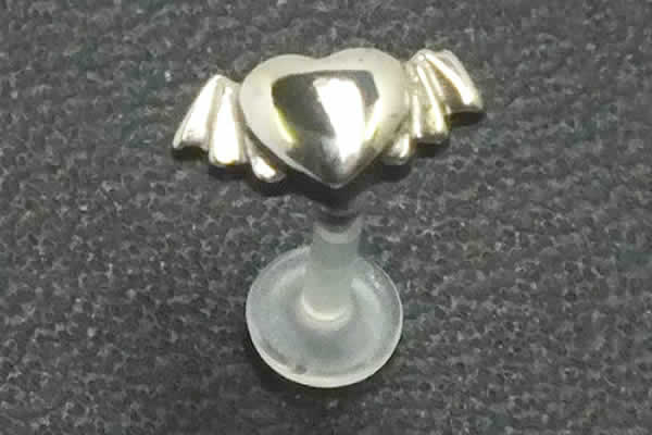 バイオフレックスのラブレットシャフトにステンレス製のハートに悪魔の羽が生えたヘッドをセットしたトラガスピアス。柔軟性のある肌にフィットするフレキシブルで人体にやさしい素材のバイオフレックスはバイオプラストの次世代型ボディピアスです。シャフト部分に穴が開いており、ヘッドのピンを差し込むように入れるプッシュピンタイプなので、装着がしにくいトラガスにも簡単に装着できる。しかもシャフトにねじ山がないので、ホールを傷つける心配もなくファーストピアスにも適したバイオフレックス素材のラブレットは、軟骨ピアスにオススメ!不器用な人でも簡単に装着できるよ。もちろんトラガス以外にヘリックスやイヤーロブなどいろいろな場所に使えます。