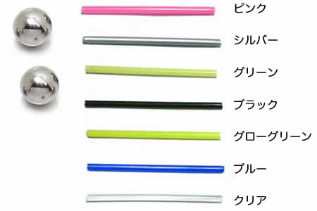 素材自体がやわらかく、ネジボールを差し込むだけでネジヤマが出来るため、好きな長さをハサミでカットしてネジボールを差し込むだけで自分のホールに合った長さ、角度にあったボディピアスが出来ます。値段も安く、カラーも7色から選べるのでいくつも持っておきたい。また、クリアは透明ピアスとしても使えるし、グローグリーンは蓄光して、暗闇で光るので目立つこと間違いなし!!